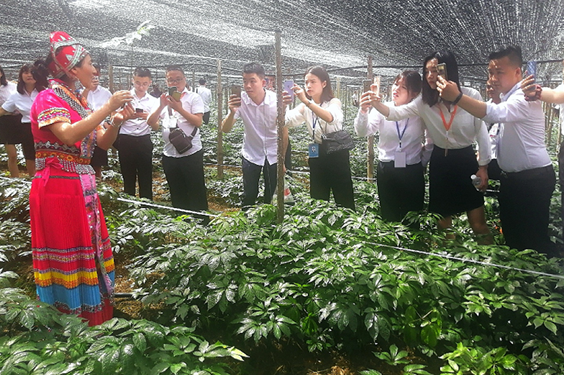 金七藥業(yè)工作人員向前來參觀考察者介紹三七種植基地情況