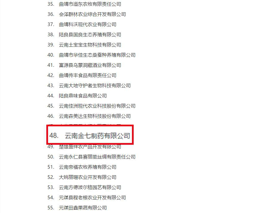 為培育壯大農(nóng)業(yè)產(chǎn)業(yè)化龍頭企業(yè),促進高原特色農(nóng)業(yè)現(xiàn)代化,2月3日,云南省農(nóng)業(yè)農(nóng)村廳網(wǎng)站公布了第十五批農(nóng)業(yè)產(chǎn)業(yè)化省級重點龍頭企業(yè)名單,云南金七制藥有限公司成功入選。