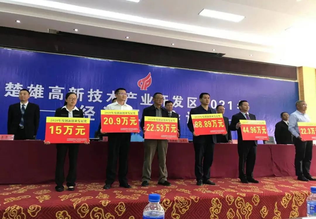 會(huì)上,高新區(qū)管委會(huì)對(duì)2020年獲得獎(jiǎng)勵(lì)和榮譽(yù)的企業(yè)進(jìn)行了表彰,公司共計(jì)獲得各項(xiàng)獎(jiǎng)勵(lì)補(bǔ)助200余萬元,其中獲得了2020年度創(chuàng)新營(yíng)銷增值獎(jiǎng)132.82萬元,是高新區(qū)內(nèi)唯一一家獲得此項(xiàng)殊榮的企業(yè),獲獎(jiǎng)金額也是此次表彰大會(huì)數(shù)額最高者,因此,在眾多生物醫(yī)藥企業(yè)中博得頭彩,公司總經(jīng)理史云龍、行政副總楊新燕分別上臺(tái)領(lǐng)獎(jiǎng)。