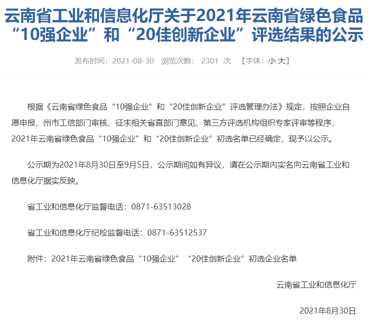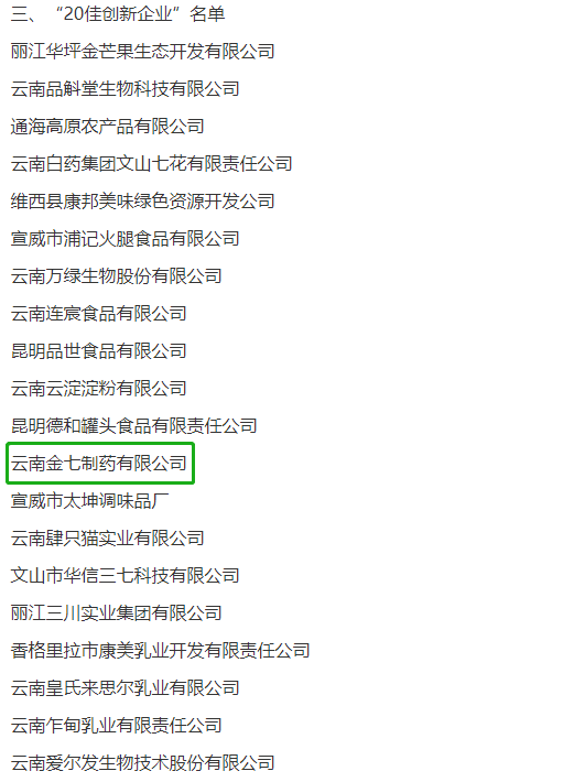 按照省委、省政府的安排部署,由省打造世界一流“綠色食品牌”工作領(lǐng)導(dǎo)小組辦公室牽頭,省農(nóng)業(yè)農(nóng)村廳、省工業(yè)和信息化廳組織評(píng)選2021年云南省“10大名品”和綠色食品“10強(qiáng)企業(yè)”“20佳創(chuàng)新企業(yè)”,9月7日經(jīng)省委常委會(huì)議第251次會(huì)議審議通過(guò),金七制藥榮獲“20佳創(chuàng)新企業(yè)”獎(jiǎng)項(xiàng)。