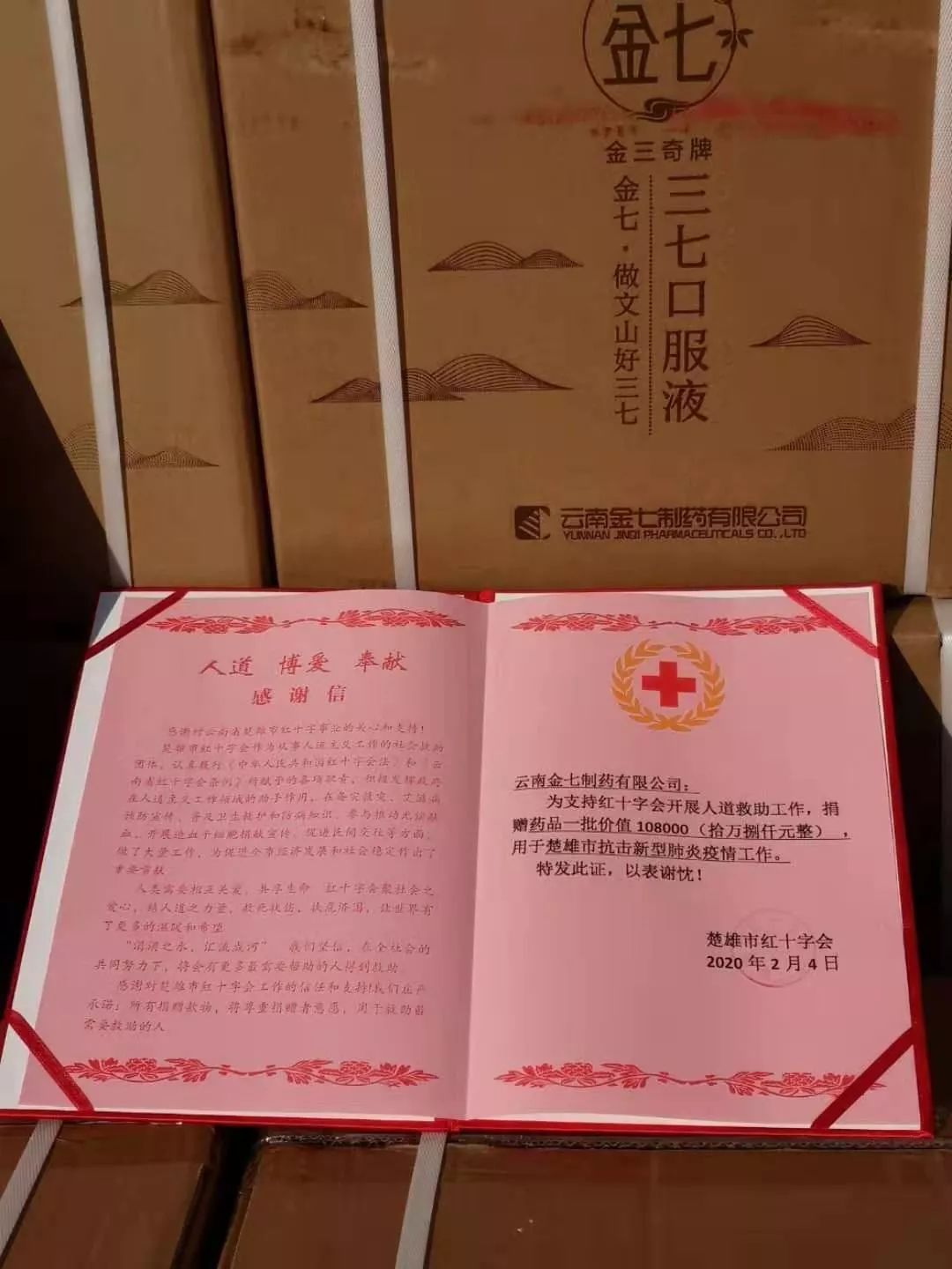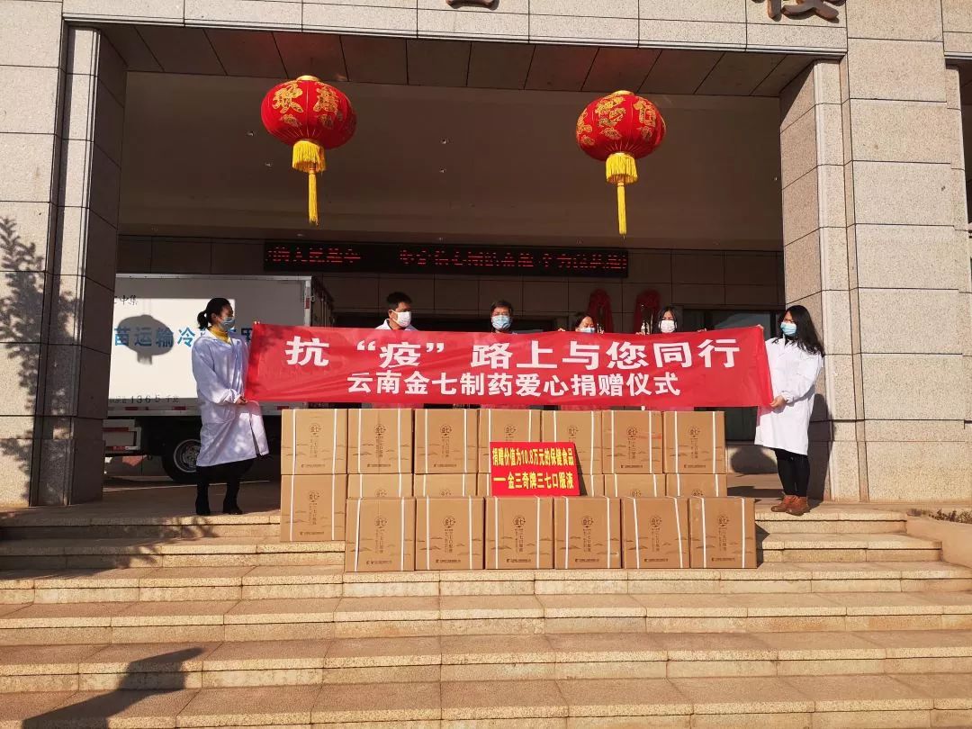 在這場(chǎng)全民參與的沒(méi)有硝煙的戰(zhàn)役中,云南金七制藥有限公司心系疫情,積極為抗擊疫情作貢獻(xiàn)。公司尤其心系工作在抗擊肺炎病毒一線的廣大醫(yī)生護(hù)士們,他們?cè)谝痪€長(zhǎng)時(shí)間、高強(qiáng)度工作,身體健康極需要得到保護(hù)。公司董事長(zhǎng)張?jiān)粕壬杆僬匍_(kāi)會(huì)議,決定為云南省白衣衛(wèi)士們和病毒感染肺炎患者捐贈(zèng)公司生產(chǎn)的三七口服液,為保護(hù)白衣衛(wèi)士和病患者們的身體健康奉獻(xiàn)公司的一份愛(ài)心。 2月4日,公司捐贈(zèng)首批價(jià)值10.8萬(wàn)元的三七口服液給紅十字會(huì)統(tǒng)一分配至各醫(yī)療單位。
