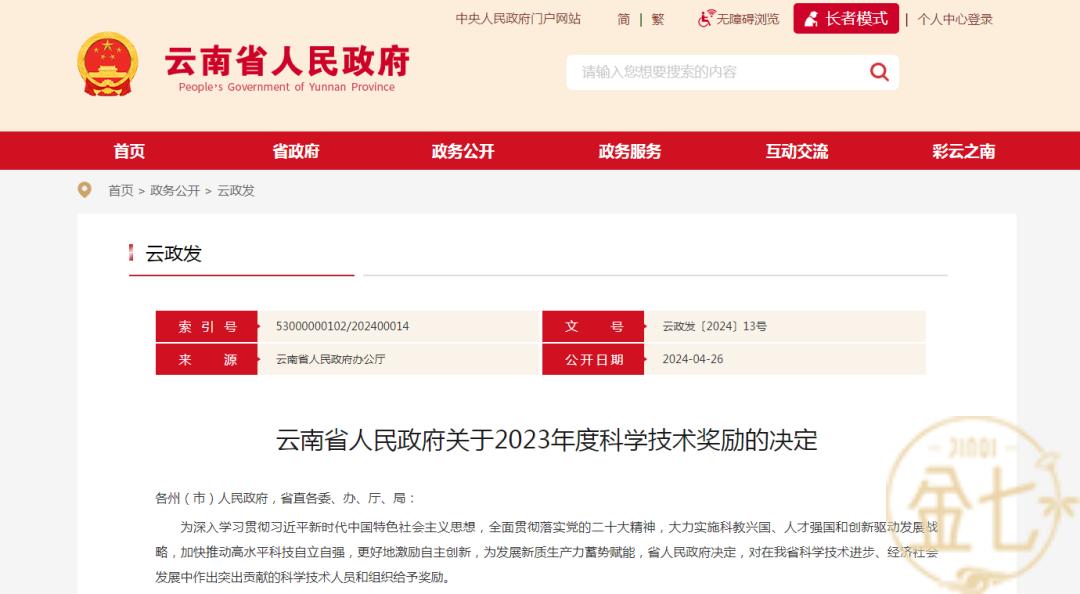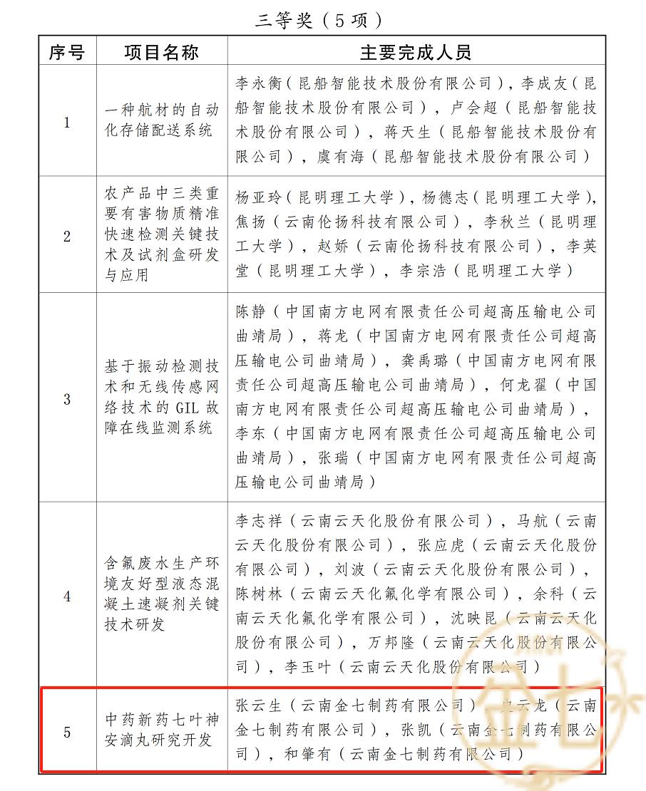 2024年4月26日,云南省人民政府公開發(fā)布了《關(guān)于2023年度科學(xué)技術(shù)獎(jiǎng)勵(lì)的決定》(云政發(fā)〔2024〕13號),云南金七制藥有限公司申報(bào)的“中藥新藥七葉神安滴丸研究開發(fā)”項(xiàng)目獲得技術(shù)發(fā)明獎(jiǎng)三等獎(jiǎng)。