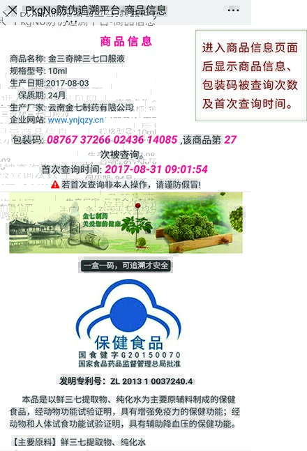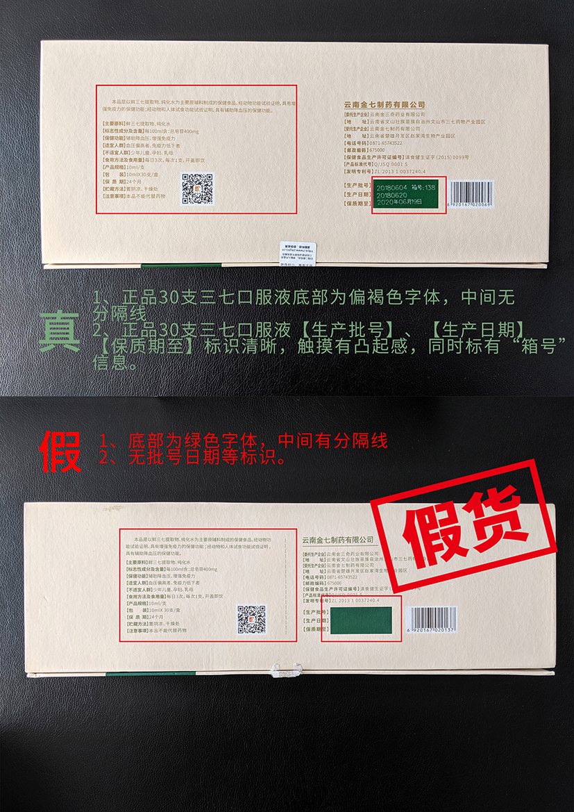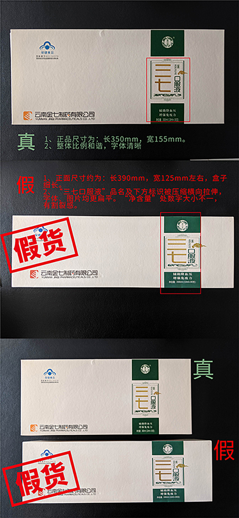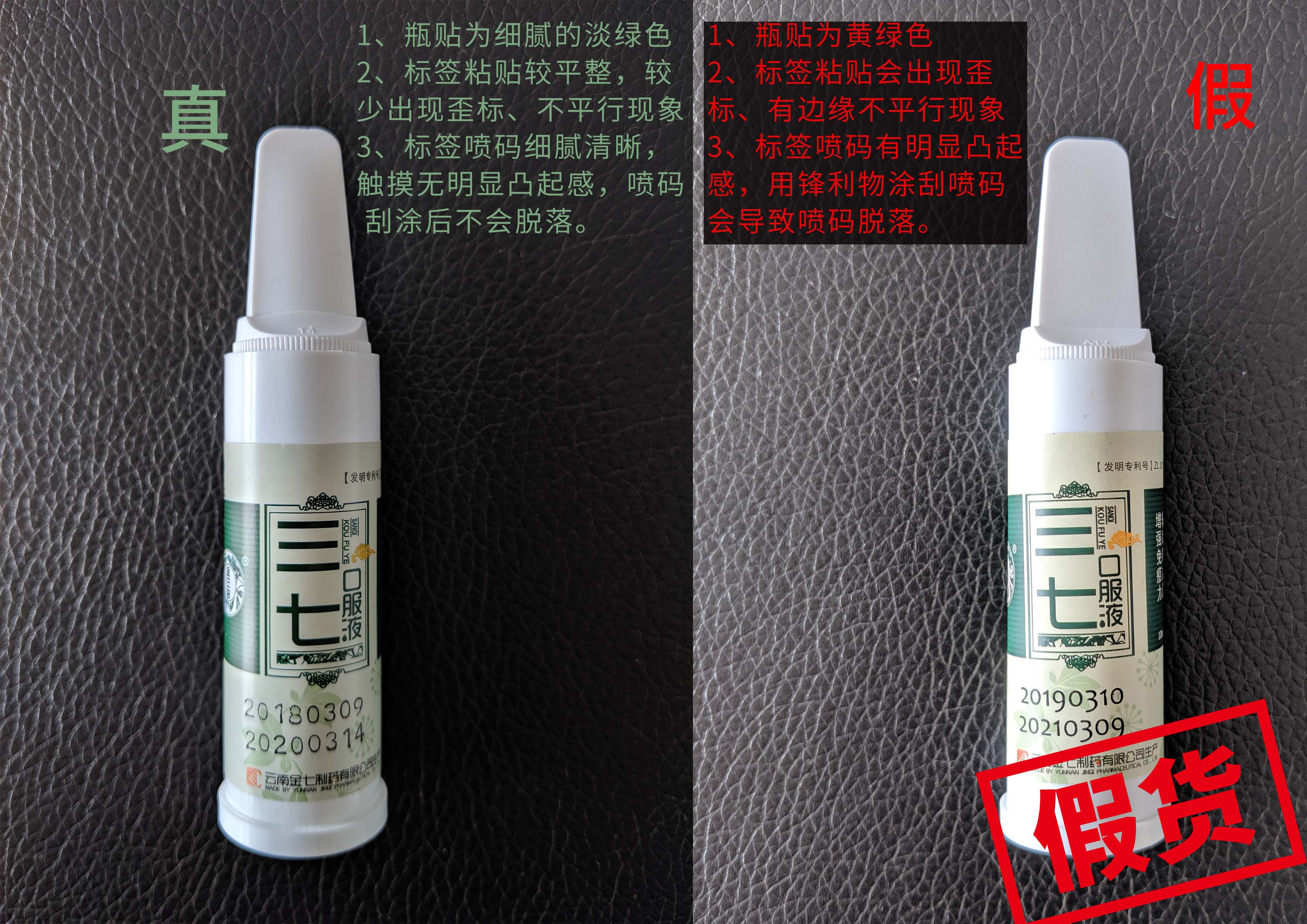 雖然假冒的三七口服液在極力模仿我們的產品,但是仍有很多細節(jié)可以對其進行真?zhèn)蔚蔫b別(真品三七口服液包裝上有一物一碼防偽標識,消費者可以通過盒子內部的驗證碼進行真?zhèn)尾樵?/strong>),請廣大消費者注意分辨。