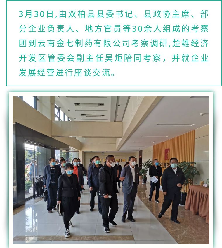 當日上午9:30,考察團一行到我公司進行現場考察,公司總經理史云龍及部門負責人熱情接待了來訪人員,公司總經理對考察團一行的到來表示歡迎,向考察團一行介紹了公司的發(fā)展歷程及近年來公司發(fā)展情況。楚雄經濟開發(fā)區(qū)管委會副主任吳炬表示,我區(qū)高度重視生物醫(yī)藥產業(yè)的發(fā)展,金七制藥為我區(qū)重點支持企業(yè),該企業(yè)的自主創(chuàng)新意識及創(chuàng)新能力較強,科技創(chuàng)新碩果累累,市場競爭能力和可持續(xù)發(fā)展能力逐步提升,為楚雄開發(fā)區(qū)經濟持續(xù)穩(wěn)定健康發(fā)展做出了積極貢獻。