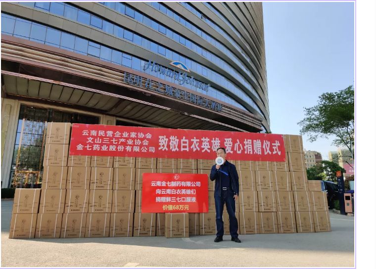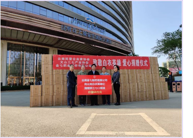 儀式現(xiàn)場,云南金七制藥有限公司向武漢一線歸來的云南1000多名“白衣英雄”們捐贈了價值68萬元的鮮三七口服液,由省衛(wèi)健委統(tǒng)一接收。