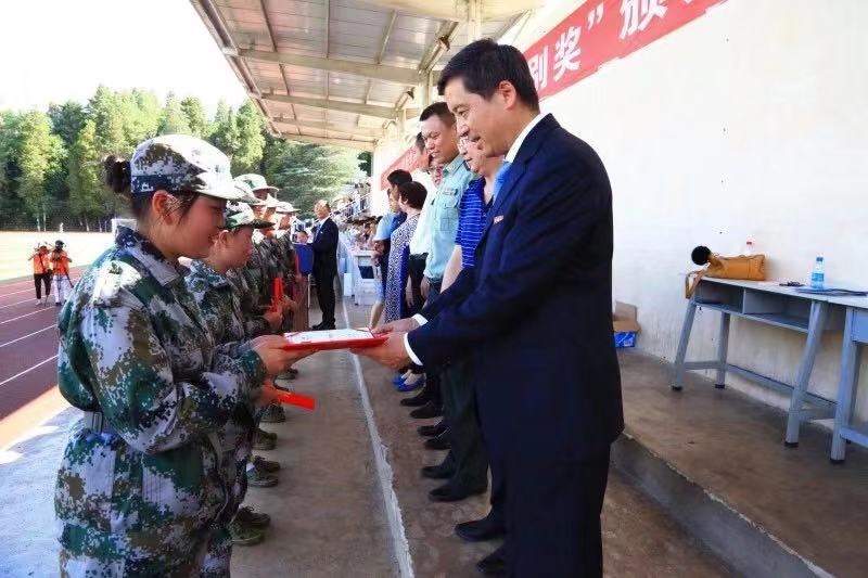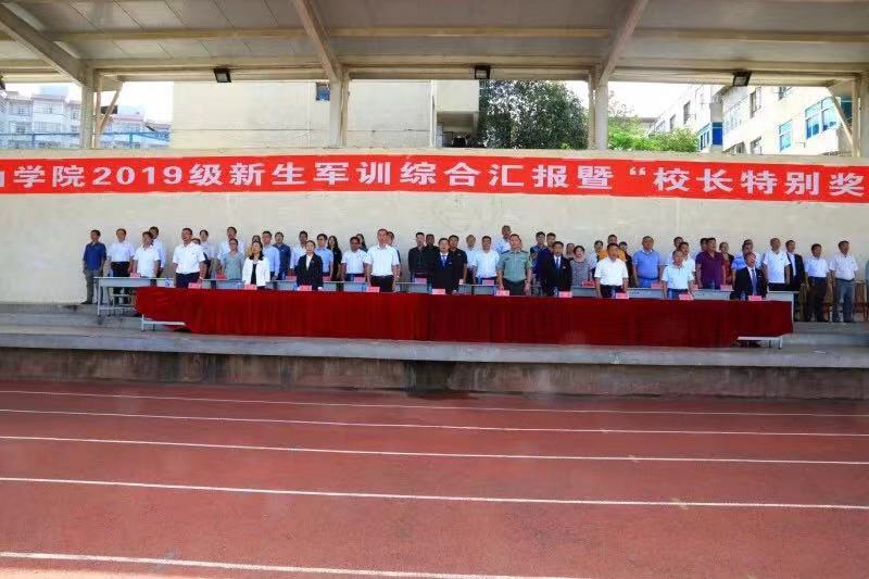 在舉國(guó)上下同慶新中國(guó)成立70周年的背景下,9月12日下午,文山學(xué)院2019級(jí)新生軍訓(xùn)匯報(bào)表演暨“校長(zhǎng)特別獎(jiǎng)”頒獎(jiǎng)大會(huì)在學(xué)校足球場(chǎng)隆重舉行。文山軍分區(qū)黨委常委、文山州學(xué)生軍訓(xùn)辦主任、文山軍分區(qū)戰(zhàn)備建設(shè)處處長(zhǎng)羅鐵斌,文山州委教育工委書記、州教育體育局黨組書記、局長(zhǎng)、文山職業(yè)技術(shù)學(xué)院和文山技師學(xué)院籌建處處長(zhǎng)袁加全,副處長(zhǎng)陳凌等領(lǐng)導(dǎo)及金七藥業(yè)股份有限公司董事長(zhǎng)張?jiān)粕?8家捐資助學(xué)企業(yè)代表出席了大會(huì),黨委副書記、校長(zhǎng)李炳澤在大會(huì)上致辭,大會(huì)由黨委副書記馮林虎主持,學(xué)校在家校領(lǐng)導(dǎo),相關(guān)部門、各二級(jí)學(xué)院負(fù)責(zé)人及2019級(jí)軍訓(xùn)團(tuán)全體人員三千余人參加了大會(huì)。